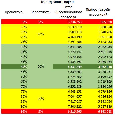 Не буду грузить вас умными терминами, но что можно увидеть и легко понять. В центре темно-зеленым выделена сумма, которая будет стремиться к той величине, что мы с вами посчитали первом действие. Но нас прежде всего будет интересовать верхняя сумма в 3,2 млн. Её можно трактовать следующим образом - если нам будет достаточно сильно не везти, то существует 5-ти процентная вероятность по итогу всех 15 лет накопить эту сумму и даже меньше. Вцелом всё выглядит не так уж драматично, мы все равно за счёт инвестиций получим примерно 1 млн сверху. Но давайте попробуем сравнить это с условно безрисковыми вложениями. Тут мы столкнемся, конечно, с другой дилеммой, а какие будут ставки по ОФЗ или депозитам на таком длинном горизонте? Это одному Богу известно. Поэтому примем в качестве предположения, что они также будут стремится в итоге к инфляции, которую мы определили в пункте 2. Тогда, при том же размере отчислений, и с той же периодичностью но уже достаточно уверенно мы сможем накопить 3,6 млн, а если снова посмотреть в таблицу, то такая величина соответствует 10-ому процентилю. Иными словами, инвестиции в ABTRUST имеют вероятность более 90% обойти безрисковые вложения, но остается 10%, что они будут хуже. Лучше всего при таких прогнозах опираться на цифры, которые в таблицы выделены зелёным цветом. Желтый - воспринимать, как возможные, но уже не столь вероятные, а красные - как кризисные. Приятным может оказаться, что мы накопим существенно больше, чем 5,6 млн, которые получили в пункте 1. По-моему, соотношение 9 к 1 стоит того, чтобы попробовать.