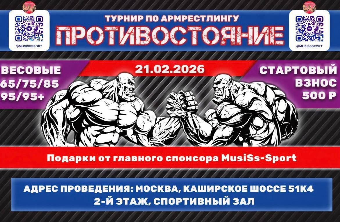 » ❗️21 февраля 2026❗️ 📍Адрес проведения: г. Москва, Каширское шоссе 51к4, 2-й этаж, спортивный зал 👉Категории: МУЖЧИНЫ: 65 / 75 / 85 / 95 / 95+ кг 🔗 Время регистрации и взвешивания: 9:30-11:00 👉 Начало поединков в 11:30 Стартовый взнос: предварительная онлайн регистрация - 500 рублей, в день соревнований - 800 рублей ⚠️ Чтобы зарегистрироваться, пишем в телеграмм @samvel26_s Борьба проводится на правой руке до двух поражений💪 🥇 Победители и призёры турнира будут награждены фирменными грамотами и медалями. А самое важное, подарками от ГЛАВНОГО СПОНСОРА MusiSs-Sport 🔥