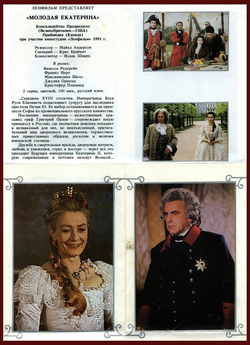 17 ФЕВРАЛЯ 1991 года состоялась ПРЕМЬЕРА двухсерийного телевизионного художественного фильма «МОЛОДАЯ ЕКАТЕРИНА» - совместного проекта США, Канады и Великобритании, снятого режиссером Майклом Андерсоном при участии киностудии «Ленфильм». «Молодая Екатерина» – одна из самых известных работ режиссёра, снявшего более 40 фильмов. В фильме мы знакомимся с немецкой принцессой Софией Августой Фредерикой, которую привозят в Российскую Империю. Роскошь и величие северной столицы, интриги, любовь и унижение —пройдя многие испытания и приняв православие с именем «Екатерина Алексеевна» , она становится великой императрицей Екатериной II. Не стоит рассматривать этот фильм с исторической точки зрения - многие события не соответствуют фактам. Но здесь найдется место приключениям, драме, любви и интригам – всё это, вместе с великолепной игрой актеров и восхитительной музыкой, увлекает Показать полностью... Присылайте ваши новости в сообщения нашего канала Мы в Max, вступайте Источник: Открыть