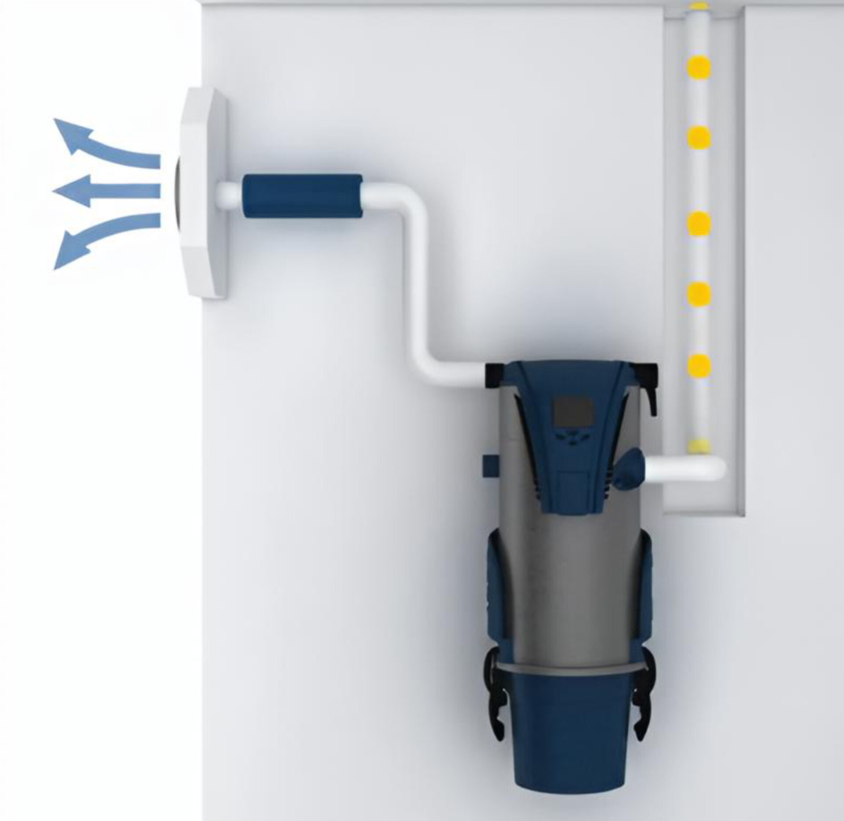 1️⃣ **Силовой блок** — «сердце» системы. Это сам пылесос, но вы его не видите и не слышите, потому что он спрятан в техническом помещении: кладовой, на балконе, в гараже или под лестницей. Именно там создаётся мощное всасывание (до 900 Airwatts — хватит, чтобы поднять даже мелкие камни).