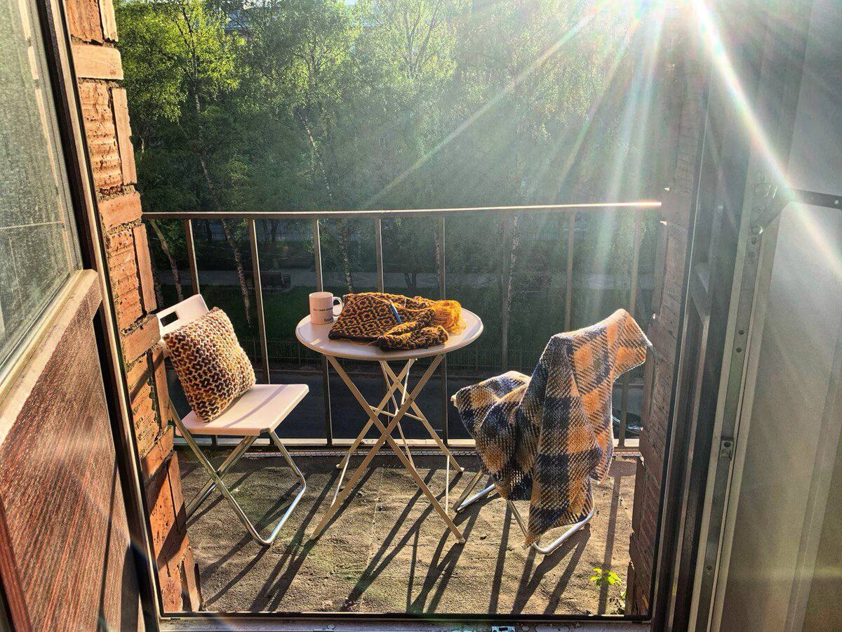 2020 год, май, разгар пандемии. Я приехала на выходные к своему парню (будущему мужу). Сидели, горя не знали — и тут Собянин призвал всех анализы сдавать — приходите, мол, как хорошо, без очереди. Ну я и пошла — «ковид у вас, где изолироваться будете?» Потом выяснилось, что не было у меня ничего, они просто тогда еще не очень порог вируса определяли) И так мы засели в квартире с балконом на две недели. Погода отличная, он курил кальян на балконе, а я вязала. Что тут у нас? Подушка на стуле — я ее сфотографировала в руках на фоне этой кирпичной кладки — потом это фото уйдет в мою первую книгу «Самый нескучный плед». Справа на стуле плед в технике «пулинг» — он станет частью моей книги «Цвет на крючке». А пока только солнце, изоляция, тишина и никаких книг. А еще, смотрите, кружка на столе с надписью «Мы с вами свяжемся». Это мерч нашего рукодельного фестиваля, который мы с подругами успели провести аж четыре раза в 2018 году. А на фоне играет джаз, как сейчас помню.