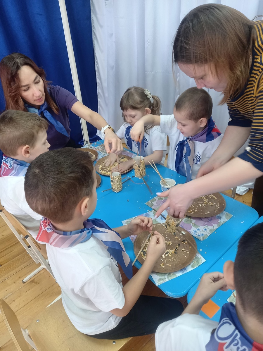 В детском саду "Радуга" села Красная Горка 12 ребят, 4 родителя, воспитатель и куратор первичного отделения собрались вместе, чтобы сделать съедобные кормушки для наших пернатых друзей, помочь птицам пережить зиму. Мы использовали только экологически безопасные материалы: туалетные втулки, мучной клейстер, шпагат, палочки от веток. Все с удовольствием включились в работу.