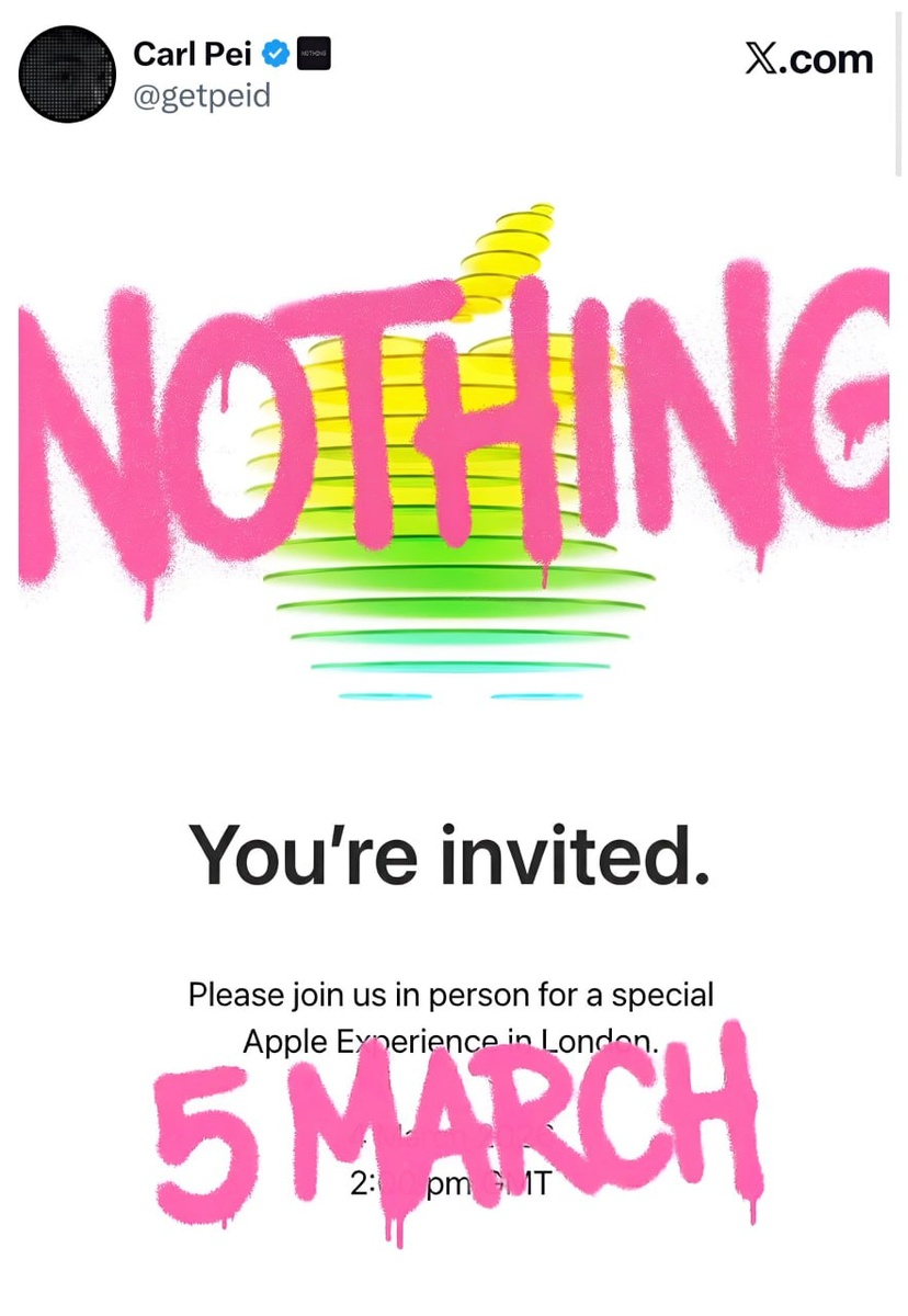 Карла Пея штормит перед выходом новой линейки его бренда. Сначала компания тизерила новинки картинкой с презервативом. На что она при этом намекнула, не очень понятно. Дальше в ход пошло изображение с таблетками — вероятно, отсылка к цвету будущих устройств. Теперь сам Пей выложил постер с анонсом Apple, будто закрашенный баллончиком. Таким образом он объявил о дате презентации Nothing — 5 марта. На следующий день после Apple 😆 👋 Hi Store