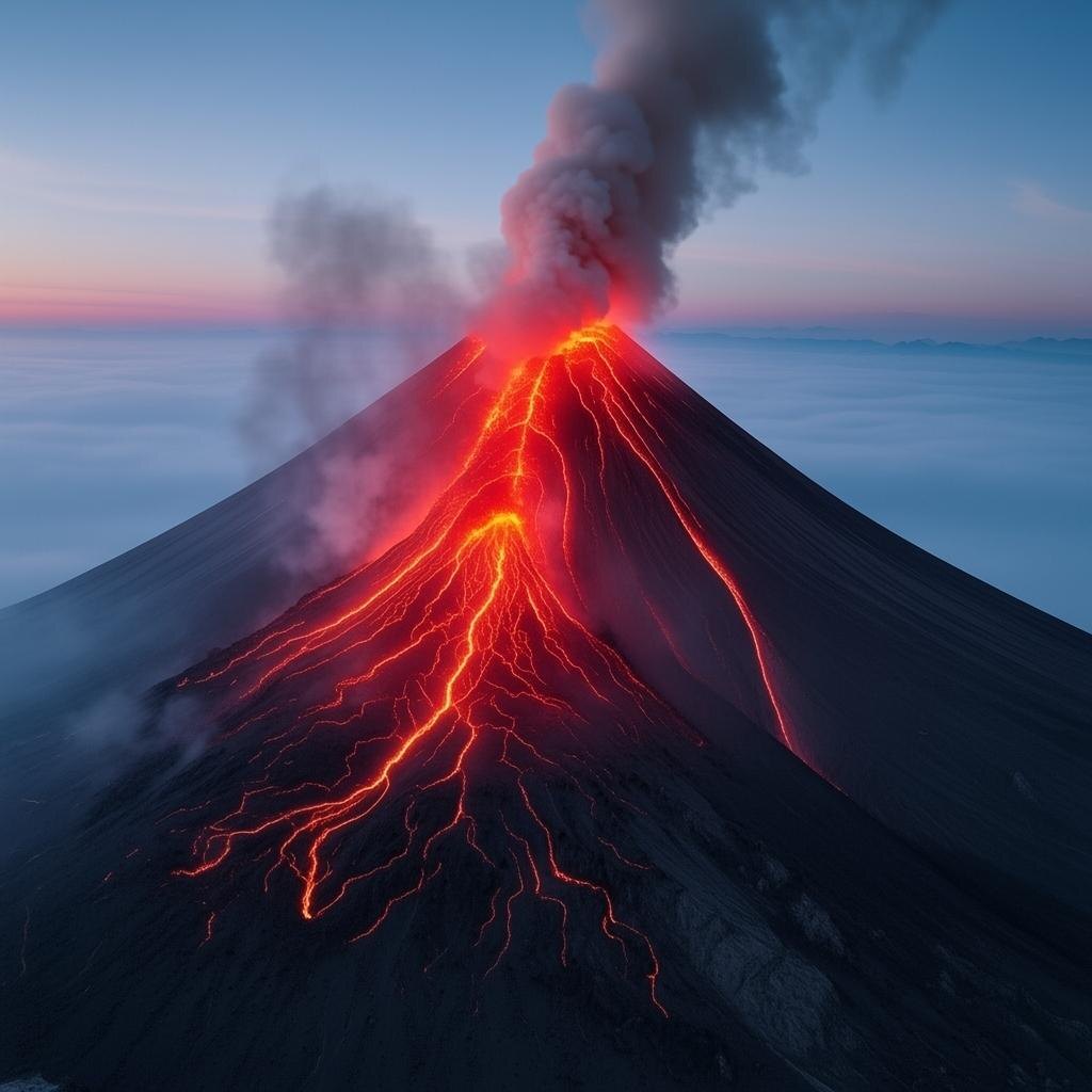 Промт 1: Реалистичный фото пейзаж действующего вулкана: ярко-оранжевая и красная лавовая лава стекает по склонам черного конуса, над вершиной поднимается темный столб пепла, густое дымовое облако, закатное небо розово-фиолетовых оттенков, облака под вулканом, высокая детализация, резкие текстуры лавы--ar 16:9 --v 5 --q 2