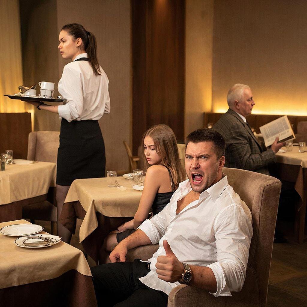 Лена открыла глаза, взяла графин с водой и направилась к четвёртому столику. За ним сидел крупный мужчина в дорогой рубашке с расстёгнутым воротом. На запястье тяжело блестели массивные часы. Взгляд у него был такой, словно весь мир существовал только для того, чтобы обслуживать его персону. Напротив, вжавшись в кресло, сидела молоденькая девушка. Она выглядела испуганной, словно случайно попала на чужой праздник. Короткое платье, светлые волосы, растерянные глаза.