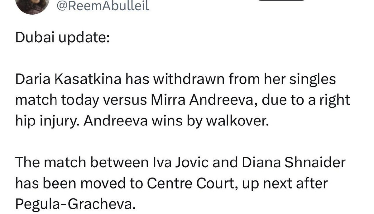 Дарья Касаткина снялась с турнира в Дубае из-за травмы правого бедра в матче против Мирры Андреевой