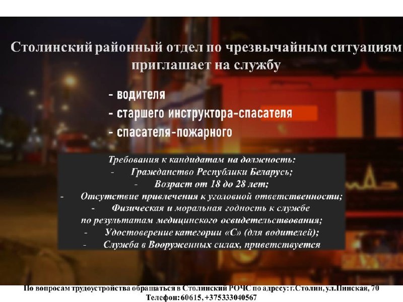 !!!🔥🚨 Требования к кандидатам на должности пожарного, командира отделения, водителя пожарного автомобиля: • гражданство Республики Беларусь • возраст от 18 до 28 лет • отсутствие привлечения к уголовной ответственности • физическая и моральная годность к службе по результатам медицинского освидетельствования • для водителей – удостоверение категории «С» • служба в Вооруженных Силах, приветствуется По вопросам трудоустройства обращаться в Столинский РОЧС по адресу: г. Столин, ул. Пинская, 70, телефон 60615, +375333040567 (понедельник-пятница с 8.00 до 17.00, обед с 13.00 до 14.00, выходные: суббота, воскресенье).
