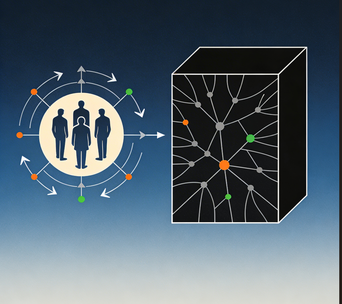 На фоне всего сказанного парадокс доверия становится менее загадочным. Мы не боимся того, что коллектив непрозрачен. Мы боимся того, что ИИ непрозрачен и при этом не встроен в привычную нам архитектуру верификации. 4.1 ИИ как «чужой» чёрный ящик Современные модели ИИ во многом повторяют ситуацию с коллективом: Снаружи это выглядит как ещё один «бредогенератор». Но, в отличие от человеческого коллектива, у ИИ нет своих социальных и институциональных механизмов проверки: Поэтому там, где человеческий коллектив опирается на сложившуюся архитектуру верификации, ИИ по умолчанию оказывается изолированным. Мы видим чёрный ящик, но вокруг него ещё нет привычной нам инфраструктуры проверки, коррекции и ответственности. Столкнувшись с этим, мы интуитивно требуем от ИИ того, чего почти никогда не требуем от людей: полной объяснимости. «Пусть система покажет, как она приняла решение, шаг за шагом, чтобы мы могли его проверить». Проблема в том, что такой запрос часто уходит мимо сути: Иначе говоря,