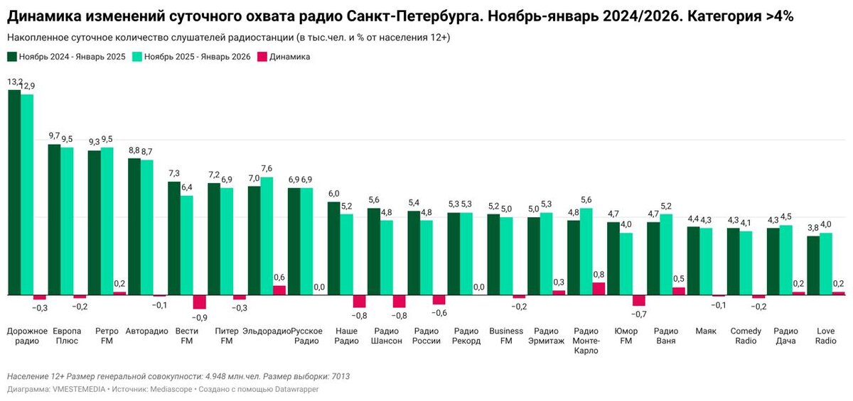 ➡️ наибольшее 📉 падение суточного охвата отмечается у радиостанций: Вести FM (-0,9), Радио Шансон (-0,8), Наше Радио (-0,8), Юмор FM (-0,7) и Радио России (-0,6)