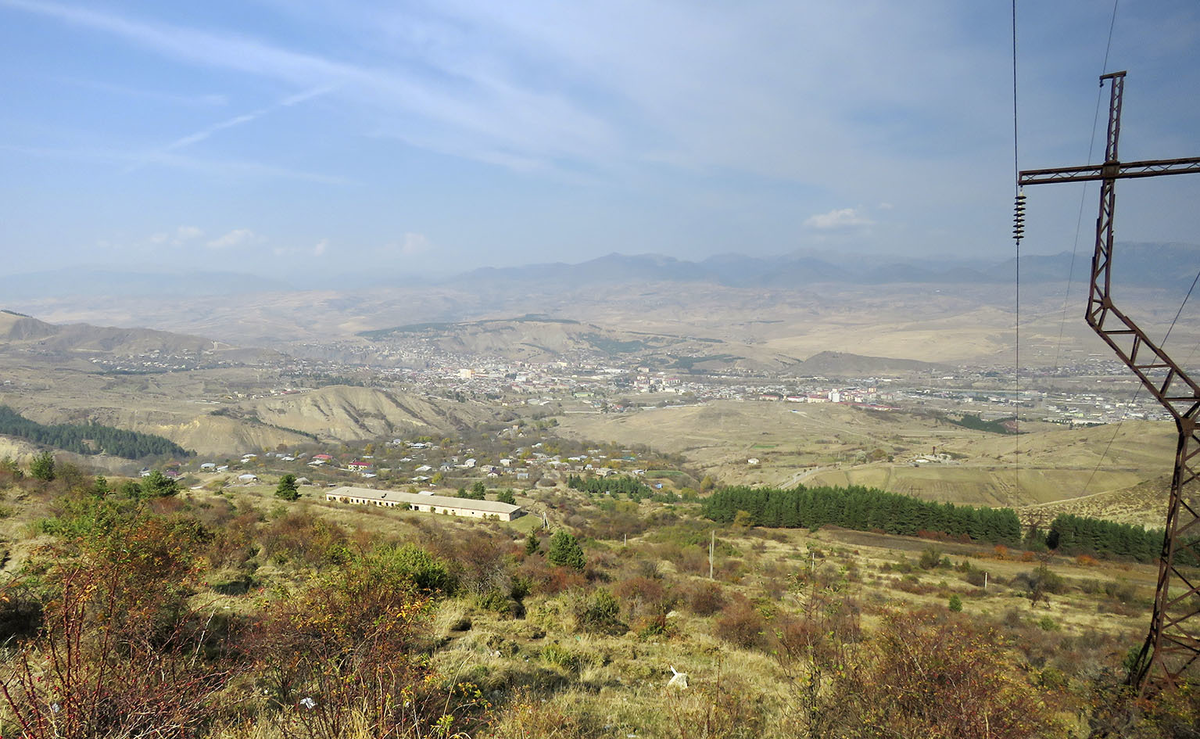 Дорога с уложенным в 2018 году асфальтом быстро взлетает над растянувшимся по долине Посхови городком, открывая на него почти самолётные виды. А затем - уходит за поворот, и вот уже вокруг только горы Малого Кавказа.