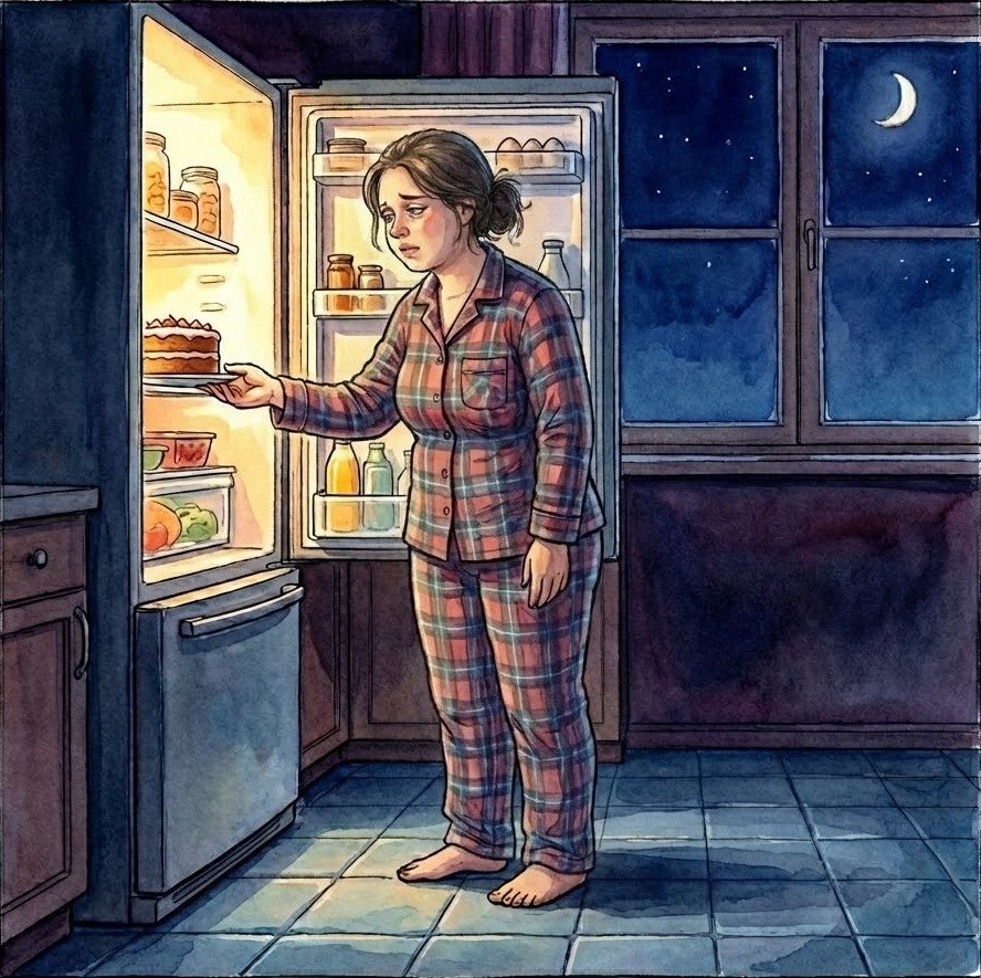 Представьте, большинство людей уже совсем не бодры, наступает ночь, переписки стихли, и хорошо бы засыпать, но именно в это время на кухне происходит сцена — холодильник открывается, и вы стоите перед ним в пижаме, точно зная, что сейчас будет короткий, почти интимный эпизод с шоколадом или холодной котлетой в главной роли.