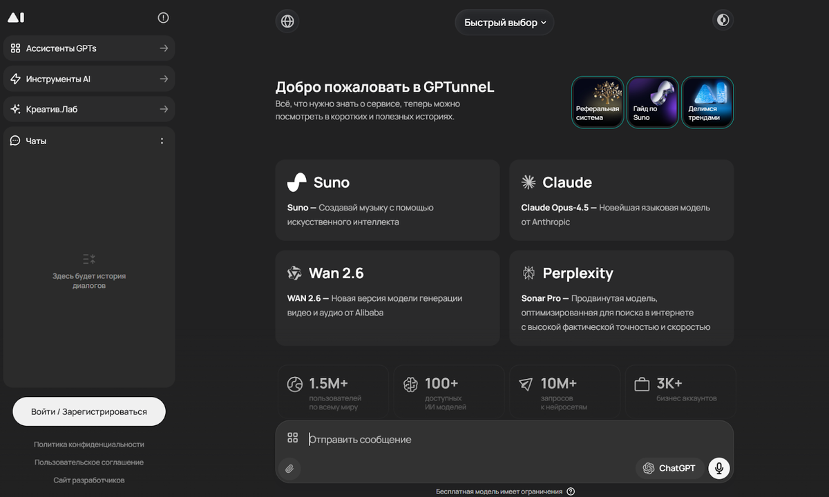 GPTunnel — универсальный шлюз к ChatGPT, Claude, Suno и другим моделям. Главное преимущество: не нужны иностранные карты и прокси, все оплачивается в рублях. Плюс внутри есть генерация видео и музыки. Для себя я использую его как основной инструмент для текстов и аналитики.
