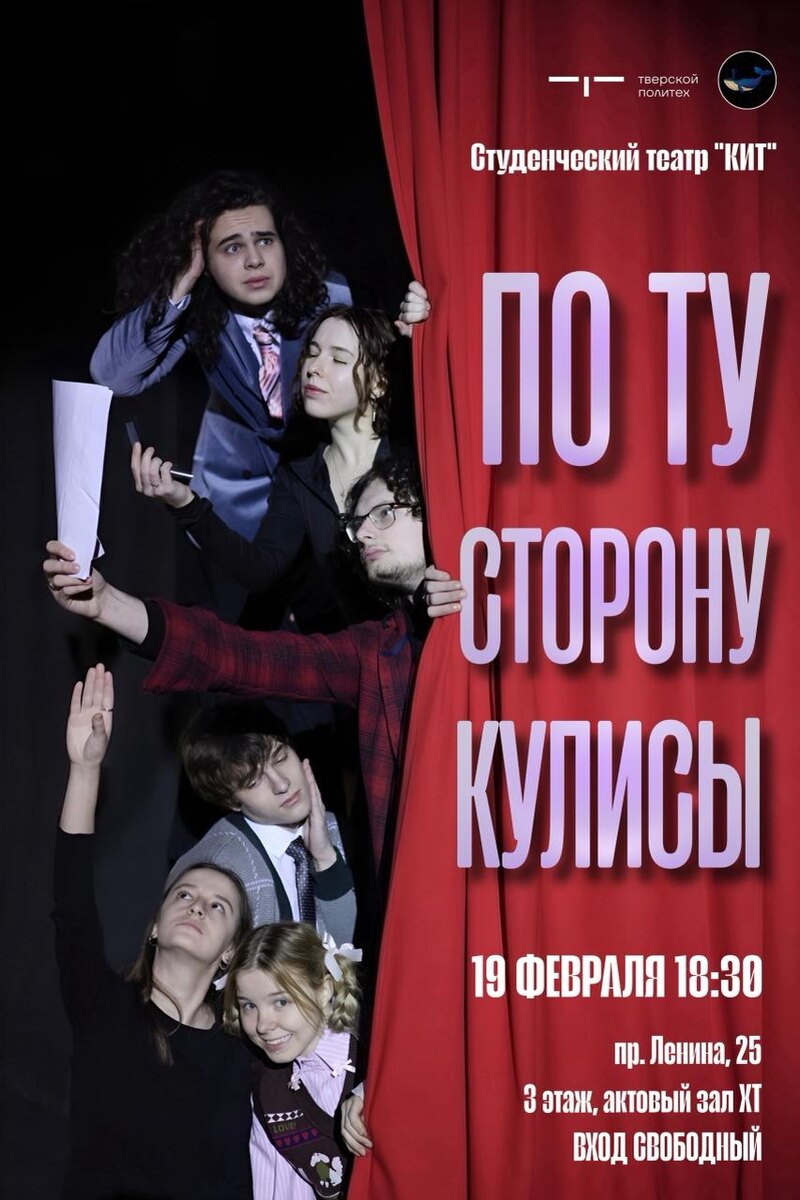 ПРЕМЬЕРА СПЕКТАКЛЯ ‼️ Приглашаем всех-всех провести свой вечер за просмотром авторской постановки студентов ТвГТУ под названием «ПО ТУ СТОРОНУ КУЛИСЫ». Наш коллектив продемонстрирует зрителю, ЧТО на самом деле ПРОИСХОДИТ во время полноценного выступления ЗА КУЛИСАМИ небольшого театра. 19 ФЕВРАЛЯ 18:30 пр. Ленина, 25 3 этаж Актовый зал ХТ ВХОД СВОБОДНЫЙ! Автор поста: Иван Соколов Дизайн афиши: Евгения Савичева, Иван Соколов, Ольга Смирнова #СтудТеатрКИТ #зимнийотчётныйспектакль #ТвГТУ #10ЛЕТ #КИТ