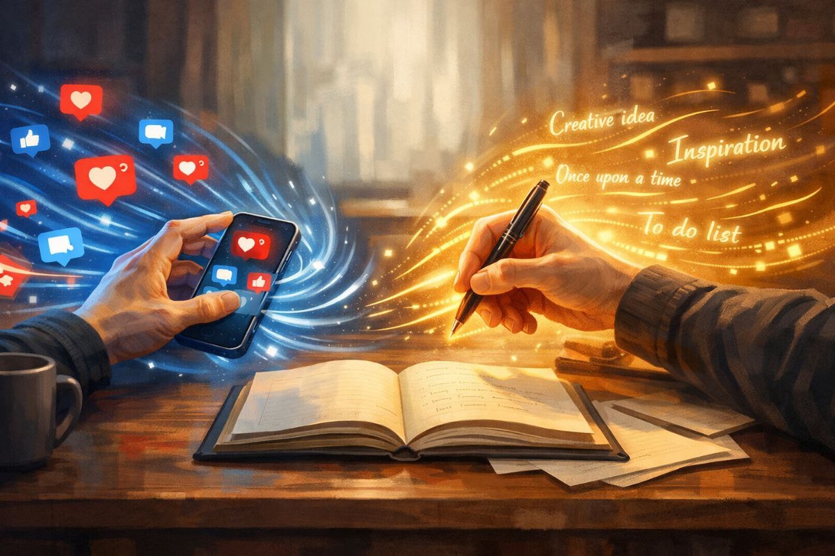 Многие представляют писательскую жизнь как череду вдохновенных моментов: уютный кабинет, мягкий свет настольной лампы, аромат свежезаваренного чая и поток гениальных мыслей, легко льющийся на бумагу. В воображении рисуется картина: автор в расслабленной позе, с лёгкой улыбкой на лице, едва успевающий за собственными идеями, которые рождаются одна за другой, словно по волшебству. Но реальность куда прозаичнее. Писательские будни — это не бесконечный праздник вдохновения, а ежедневная работа, где рутина соседствует с самодисциплиной, а маленькие победы добываются упорным трудом. И я, только‑только вступая на этот путь, уже ощущаю всю его неоднозначность. Утро начинается не с творчества, а с внутренней борьбы. «Сегодня точно напишу главу!» — обещаю я себе, заваривая кофе. Но едва сделав первый глоток, рука сама тянется к телефону. Почта, соцсети, новости — мир настойчиво требует внимания, подкидывая десятки отвлекающих факторов. Каждая минута, потраченная на скроллинг ленты, кажется безоб
