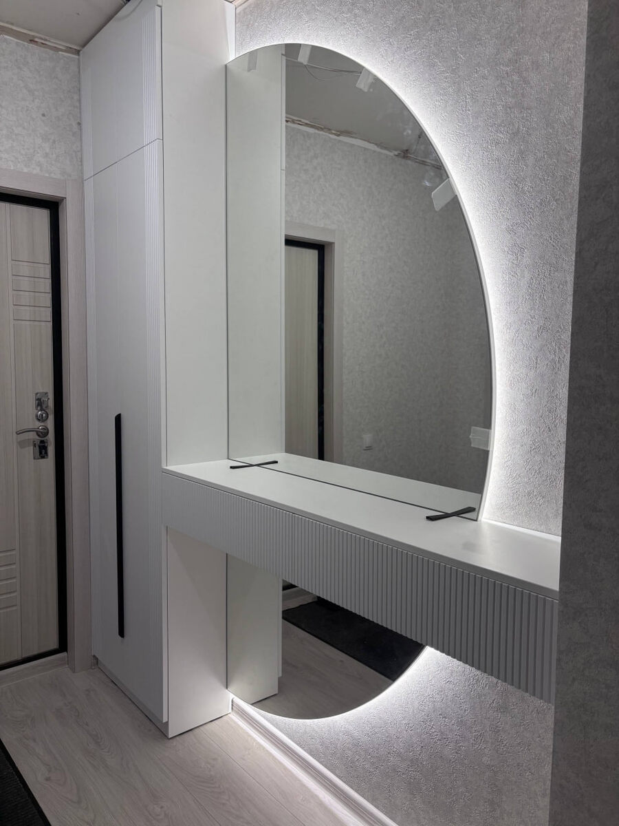 ! Большое зеркало с изгибом и подсветкой - для создания сногсшибательного образа, туалетный столик - для этих вот Гуччи и Диор, для всего остального - ящики с рифлёными трендовыми фасадами - ведь стиль, однажды взятый в союзники, вскоре распространится и на всё окружение его носителя! Шкаф для обуви, пар на двадцать - для самых разных случаев, плавное открытие дверок - для настроения, - эта прихожая для Елены - как быстрая зарядка для Теслы, фабрика по производству эмоций! В унисон с вашим сакральным пространством, Планета Купе!