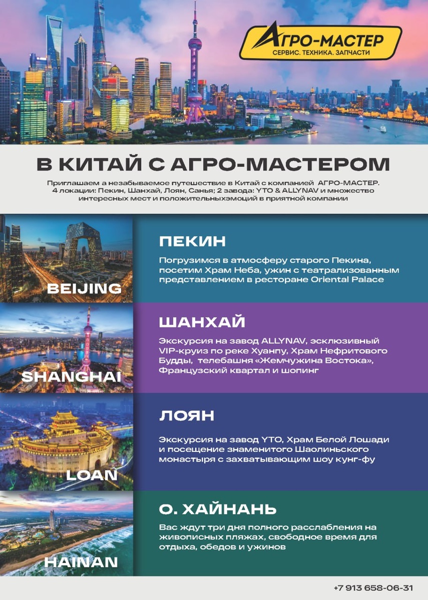 !!! 🖐 В нашей группе в Китай еще остались места. ⭐️ 4 локации: ⭐️ ✔️ Пекин — величие императорского Китая. Прогулка по Запретному городу и дух древних традиций в Храме Неба. Вечер — незабываемое театрализованное представление во время ужина. ✔️ Шанхай — пульс современного Китая. Подъем на телебашню Жемчужина Востока, вечерний круиз по реке Хуанпу с огнями небоскребов и экскурсия на завод AllyNav, где создают умные навигационные системы для сельского хозяйства будущего. ✔️ Лоян — мощь китайской индустрии и дух кунг-фу. Экскурсия по заводу YTO (легендарные тракторы «Дунфанхун», музей и современные сборочные линии). Завершение дня — монастырь Шаолинь с завораживающим шоу монахов. ✔️ Санья — тропический рай в бухте Дадунхай. Роскошный отдых в отеле с тремя бассейнами в двух минутах от моря. Кульминация — парк Yanoda: джунгли, водопады, стеклянный мост над ущельем и зиплайн. ‼️ и это все в приятной компании единомышленников. ⚡️ Торопитесь! ⚡️ 📣 Подробная информация у вашего мен
