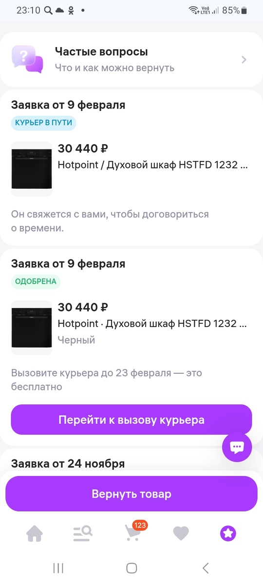 Продавец одобрил возврат и далее необходимо было так же как и при заказе товара вызвать курьера указав удобную дату, что я и сделала выбрав также субботу выходной день 14.02.26. В приложении в субботу 14.02.26 появилась надпись курьер уже в пути, однако ни в назначенный день, ни на следующий, и последующие дни курьер так и не приехал и не позвонил.