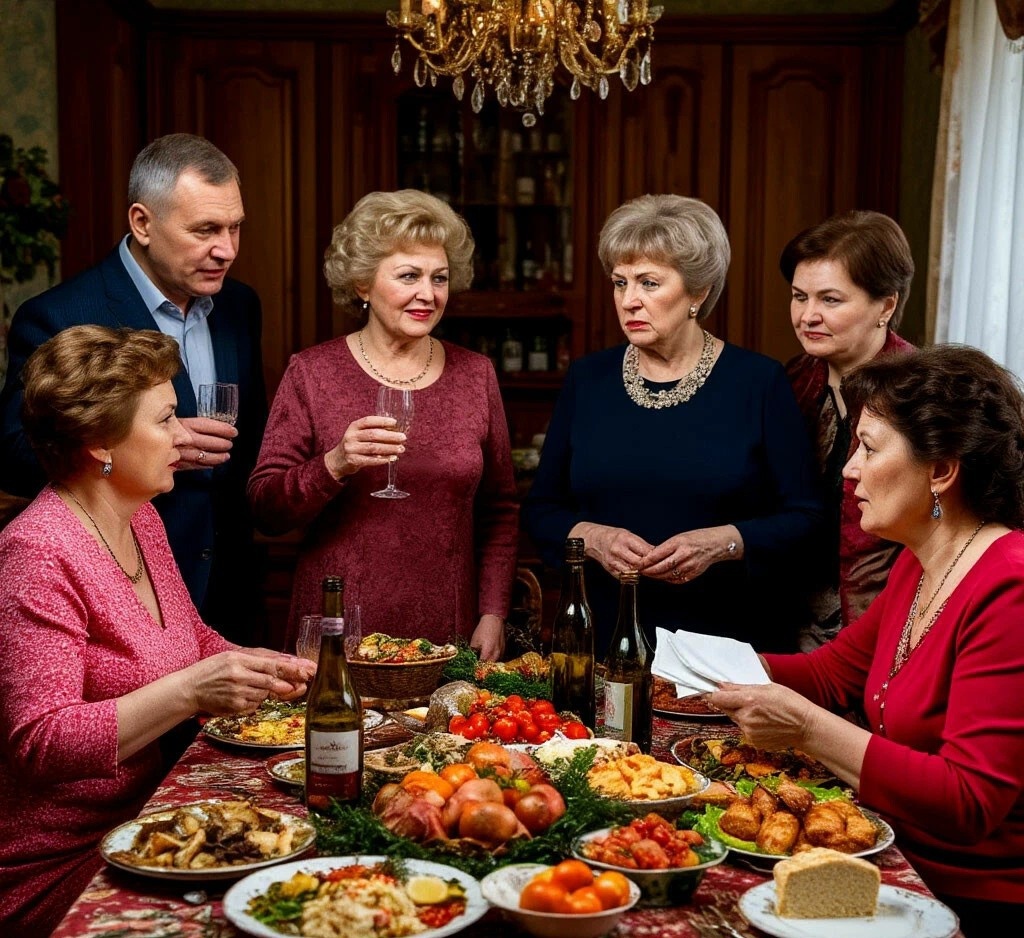 Тамара Петровна стояла у плиты в цветастом халате и застиранном фартуке. Она жарила котлеты, и брызги жира летели во все стороны. На столе уже стояли тарелки с нарезанными овощами, селедка под шубой в глубокой миске, бутерброды со шпротами.