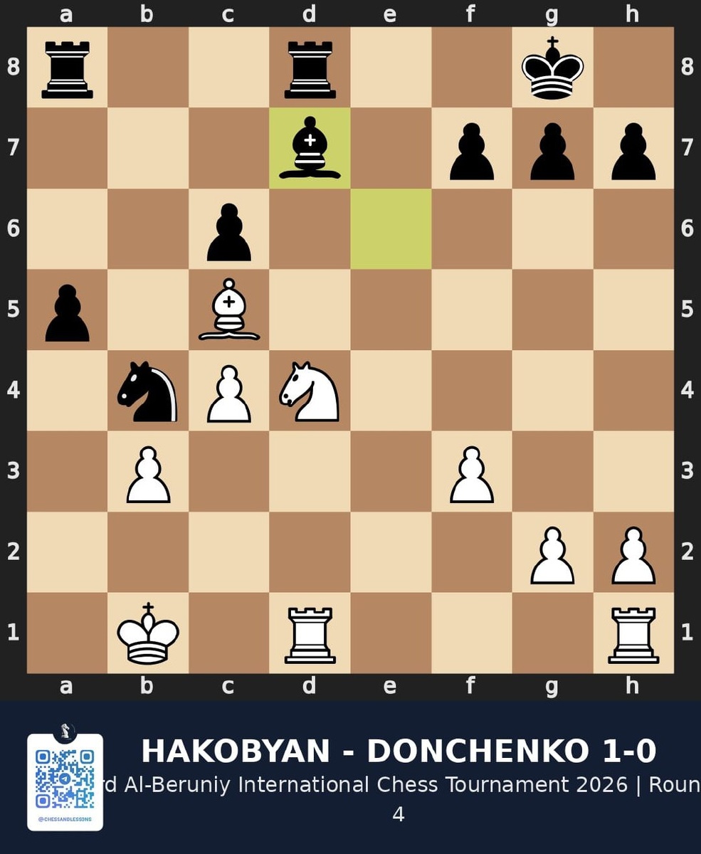 Армянский гроссмейстер Арам Акобян (2619) обыграл Александра Донченко (2655) в 4-м туре турнира Al-Beruniy 2026! Закрытая сицилианка с ранним выводом ферзя. Акобян избрал необычную схему с фианкетто и длинной рокировкой - короли оказались на разных флангах. Донченко активно играл - перевёл ферзя на a5, забрал пешку на a3, но взамен получил мощное давление белых по центру. После тактического удара Кd5 произошёл размен ферзей. Ключевой момент - 21...Сd7? Слон ушёл на пассивную позицию, а надо было 21...Кa6! Оценка сразу прыгнула с +0.4 до +1.6 в пользу белых. Дальше Акобян методично давил: Сb6, Сa5 - забирая пешки на ферзевом фланге. В цейтноте Донченко допустил ещё ошибки, и проходная пешка "c" решила исход партии. Финал красивый - 59.Кe7+ с вилкой, и пешка c7 неудержима! Разбор с комментариями: https://lichess.org/study/K3IGgk2c/FAGAuo4t