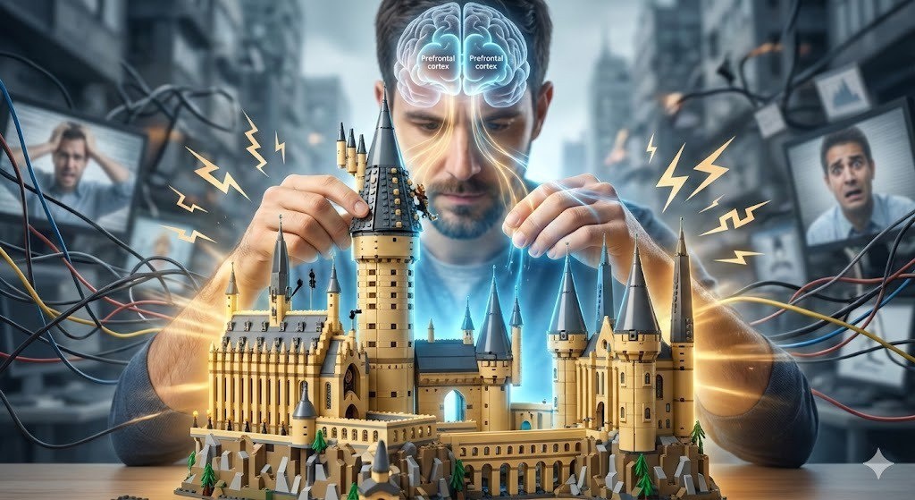 » На видео — второй день моей сборки. Куча пластикового хлама на полу постепенно превращается в упорядоченную структуру. И пока пальцы ищут нужный кубик, в голове происходит процесс, который многие ошибочно называют «отключением мыслей». Давайте сразу к делу: медитация в её массовом понимании (благовония, позы, мантры) — лишь одна из форм, причём не самая доступная для западного человека с его бешеным ритмом и перегруженным неокортексом. Для меня, как для психолога и любителя чётких систем, медитация — это прежде всего изоляция внимания. Когда мы говорим о «потоке», мы не обсуждаем эзотерику. Мы обсуждаем нейрофизиологию. Наука: Что происходит с мозгом «в замке»? Если в прошлом посте мы разбирали Дефолтную систему (DMN), то сегодня посмотрим на концепцию временной гипофронтальности, предложенную нейробиологом Арне Дитрихом. Суть проста: наши когнитивные ресурсы ограничены. Префронтальная кора — наш «директор», отвечающий за планирование, самокритику, анализ прошлого и тревогу о буд
