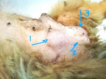 Животное - мелкая собака массой 5 кг. лежит в спинном положении. Правый семенник в стадии перерождения в опухоль. Лечение хирургическое, прогноз благоприятный. На фото: 1 - правый семенник, 2 - "пустая" мошонка правого семенника, 3 - левый семенник в мошонке в состоянии физиологической нормы.