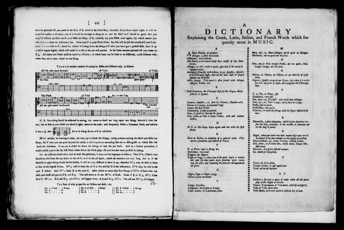 Фолкенера (1774) начинается с ноты До по настроечной трубке. Принцип строя: терции делаем острыми, квинты — плоскими. Секрет в том, чтобы настроить интервал чисто, а затем едва заметно сдвинуть: терцию выше, квинту ниже. Проверочный ключ — Ми. Если оно звучит слишком высоко, квинты перетянуты. С Фа процесс зеркальный. Автор просит не рвать струны: лучше недотянуть, чем перетянуть. Он добавляет, что учителя музыки критикуют его лишь из-за того, что он сбивает цены на инструменты. Трактат описывает и толщину струн. Верха — сталь №4 (или №3). Середина — №5, 6, 7. Басы: сталь №8, затем латунь №8, 9, 10. Самый низ (от Си) — медь №11, 12, 13. Совет напоследок: не задерживайтесь долго на одной струне, чтобы не утомить слух, и чаще проверяйте строй трезвучиями.