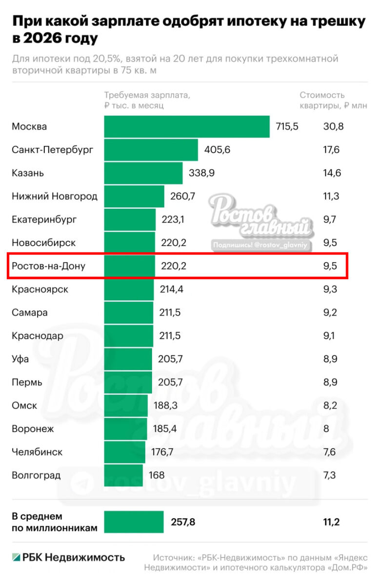 🏗 Чтобы купить в Ростове трёхкомнатную квартиру 75 м² за 9,5 млн руб в ипотеку на 20 лет, нужно зарабатывать от 220 тыс руб