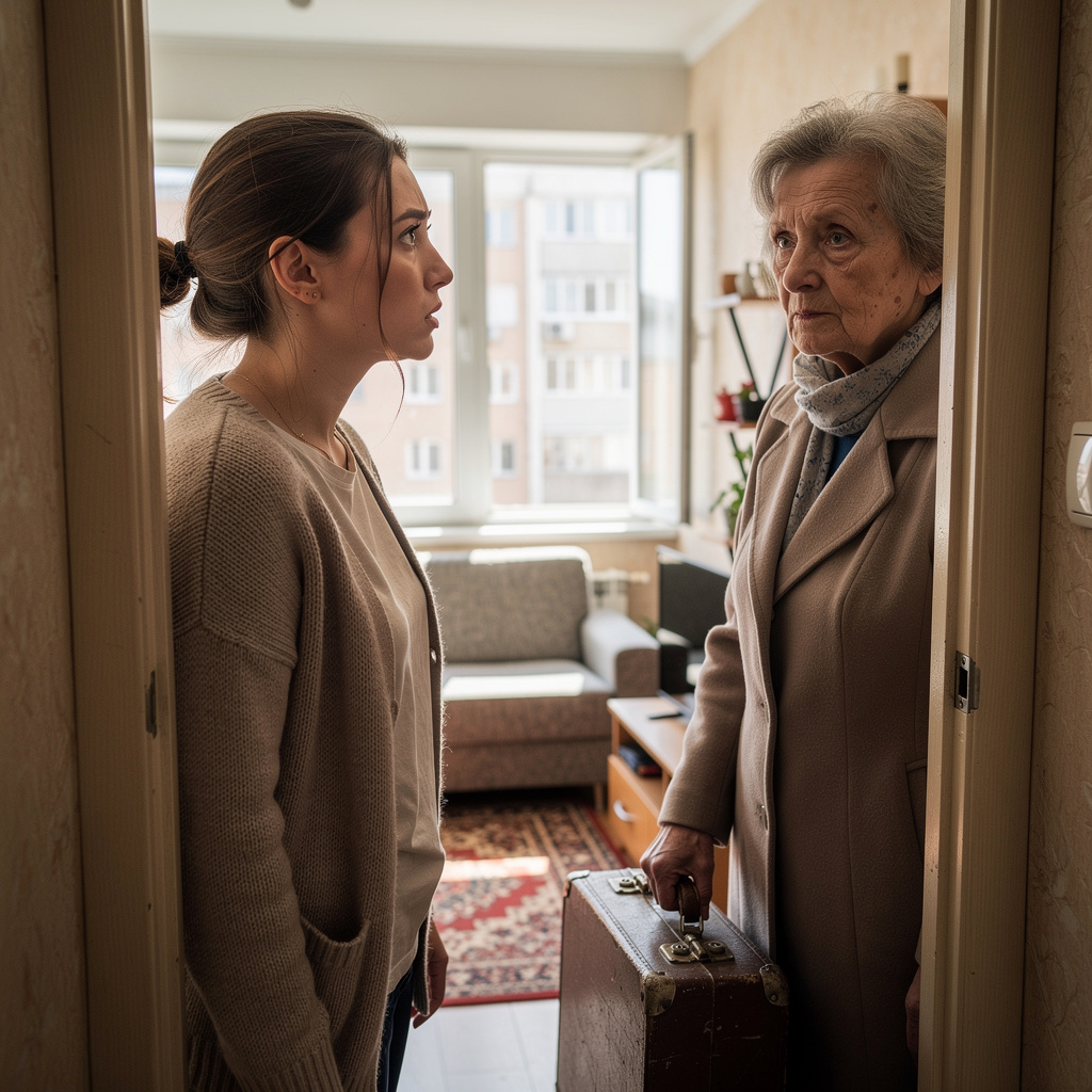 Оксана открыла дверь и замерла. На пороге стояла Валентина Ивановна с небольшим чемоданом в руках. Свекровь выглядела уставшей, волосы растрепались, лицо осунулось. Она молча смотрела на Оксану, и в этом взгляде не было привычного холода.