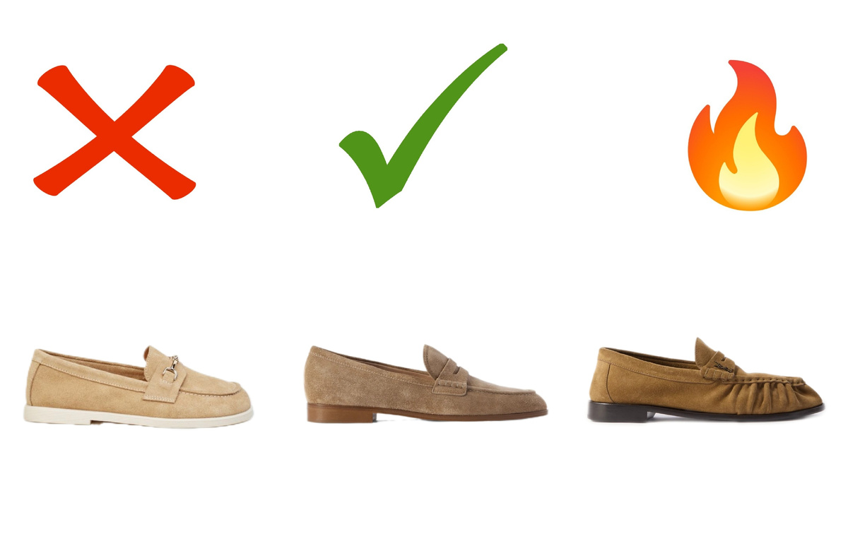 ❌Устарело: Старомодные лоферы легко распознать по короткому и тупому мыску. Подобные варианты выглядят неуместно рядом с современной свободной одеждой, создавая дисбаланс пропорций.