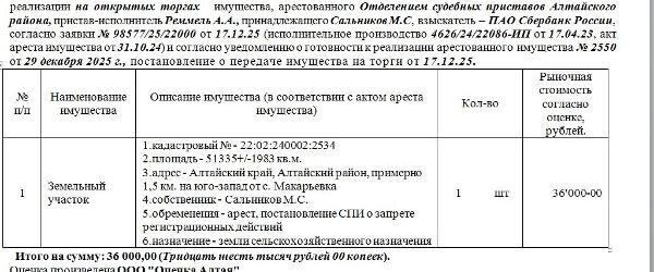 , примерно 1,5 км. на юго-запад от с. Макарьевка. Нач. цена 36000 руб. (Сальников М.С., обременения - арест, постановление СПИ о запрете регистрационных действий) (2550) Канал: Госземля Алтайский край Область: край Алтайский Алтайский край Район: Алтайский район Населенный пункт: примерно 1, 5 км. на юго-запад от с. Макарьевка. Локация: Смотреть на карте ВРИ: Сельскохозяйственное использование Кадастровый номер: 22:02:240002:2534 Кадастровая стоимость: - Вид сделки: Продажа Площадь: 51335 м² Начальная цена: 36000.00 руб. Дата завершения: 16.03.2026 Подробнее: ГИС ТОРГИ #госземля #земляотгосударства #земля #земельныйучасток #земельныеторги #торги #аукцион #продажаземли #продажа #алтайскийкрай