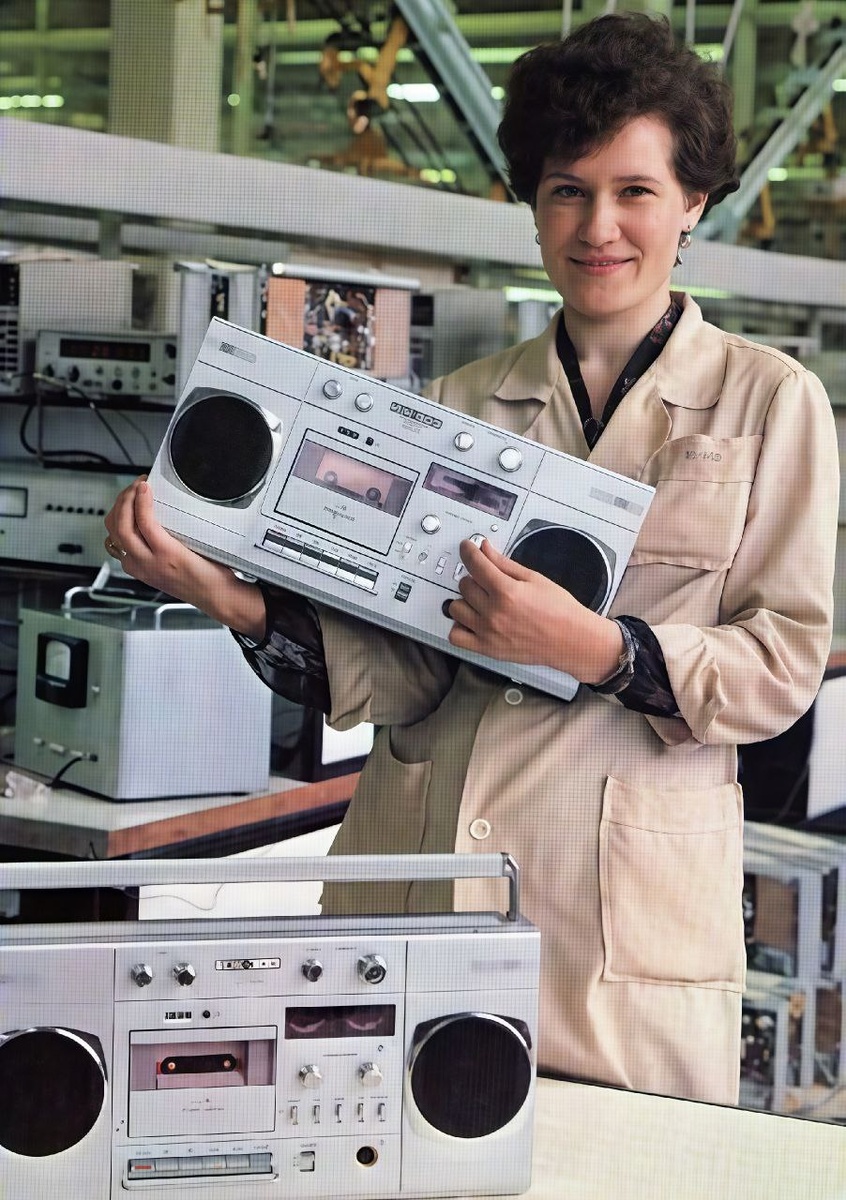 ! Фото после обработки ИИ. Кассетный стереофонический магнитофон "ИЖ-303-стерео" с 1984 года выпускал Ижевский мотозавод. Магнитофон предназначен для записи фонограмм на ленту А4205-ЗБ в кассете МК-60 и их последующего воспроизведения. Предусмотрена ручная и автоматическая регулировка уровня записи, автостоп при обрыве или окончании магнитной ленты, счётчик расхода ленты и устройство память, стрелочные индикаторы уровня записи, система шумопонижения. К аппарату можно подключить внешние АС и головные телефоны ТДС-9,ТДС-6. Питание универсальное: 8 элементов 343 или сеть. Скорость движения ленты - 4,76 см/с. Коэффициент детонации ±0,35 %. Номинальная выходная мощность 2х1 Вт. Диапазон воспроизводимых частот на ЛВ 63...10000 Гц. Относительный уровень шумов и помех с СШП -56 дБ. Габариты магнитофона 442х217х116 мм. Масса с батареями около 5 кг. Розничная цена 285 рублей. С 1987 года магнитофон именовался как ''ИЖ М-303-стерео''. Источник: https://vk.ru/wall-217982501_33478