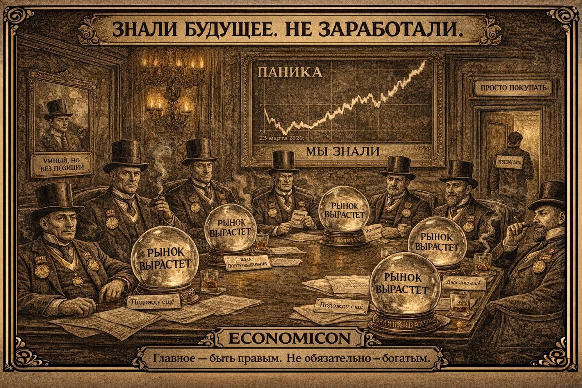 Любимая фантазия инвестора: «Вот бы вернуться в февраль 2020-го. Я бы вышел перед обвалом. Потом зашёл на дне. И стал легендой». Давайте аккуратно, без фантазий. Конец февраля 2020 — рынок уже падает примерно на 10–12% от максимумов. Все умные выходят «переждать». Дно — 23 марта 2020 года. В разгар паники. Локдауны. Самолёты стоят. Вакцины нет. Будущего нет. С августа рынок уже полностью восстановился. В ноябре, когда объявили про вакцину 95% эффективности, индекс был уже сильно выше мартовского дна — рост от минимума около 60%. А от конца февраля — тоже уже плюс. То есть если бы вам показали будущее и вы решили «зайти, когда станет понятно» — вы бы опоздали. Парадокс? Нет. Это и есть рынок. Он растёт не на хороших новостях. Он растёт на ожидании, что дальше будет менее плохо. Проблема частного инвестора в том, что он торгует заголовки. Рынок торгует вероятности. Вы видите: «всё плохо». Рынок видит: «хуже уже в цене». Вы ждёте ясности. Рынок уже уехал. И ещё неприятный момент: лу