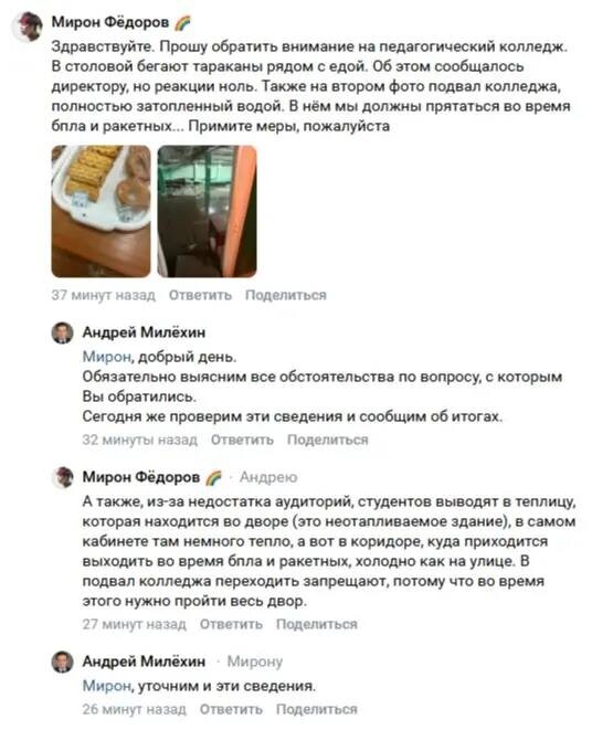 ? Житель Белгорода обратил внимание на серьёзные проблемы в педагогическом колледже. По его словам, в столовой бегают тараканы рядом с едой, а подвал, который должен служить укрытием во время сигналов об опасности БПЛА и ракетных ударов, полностью затоплен водой. Кроме того, из-за нехватки аудиторий студентов выводят заниматься в неотапливаемую теплицу во дворе, где в коридоре температура почти как на улице, а переходить в затопленный подвал студентам запрещают из-за необходимости пересекать открытый двор. Министр образования Андрей Милёхин отреагировал на обращение и пообещал провести проверку педколледжа. Подписаться на 🗞🗞 | Мы в МАХ