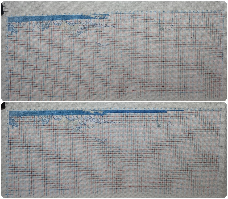 Вчера работала над пейзажем, добавилось 1114\\. Сегодня визуально прогресс кажется прямо огромным. Хотя он и правда считай на 100 стежков больше обычного. Ну тут просто так вышло, дошивала последнюю ниточку. А так как в схеме я наткнулась прямо-таки на огромный одноцветный участок, из одной ниточки получается больше сотни стежков. Ведь она не тратится на протяжки и закрепки. Ну и как видно, участок чуть ли не вполовину ширины, поэтому и визуально прирост кажется большим. Хотя я не закончила даже ряд в 10 клеточек. Будем дошивать в следующий раз. А сегодня.. Возвращаемся к Розочкам. Здесь я дошла до бело-розовой розы. Будем двигаться к ее серединке. Вчера нам выпало вязать кофточку с сердечками. Но перед этим я решила потратить полчасика на вязание образца для расчётов нового проекта. Связала вот такой образец по кругу. Так что на фото он сложен пополам. Запланированный проект будет вязаться по кругу и 2мя узорами. Поэтому и образец у меня получился вот такой. Теперь он пойдет стираться
