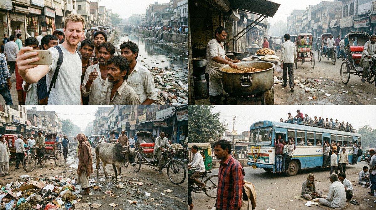 В Варанаси открытая канализация течёт прямо по улицам. Мусор лежит горами вдоль дорог – пластик, органика, всё вместе. Коровы бредут между машинами, оставляя следы на асфальте.