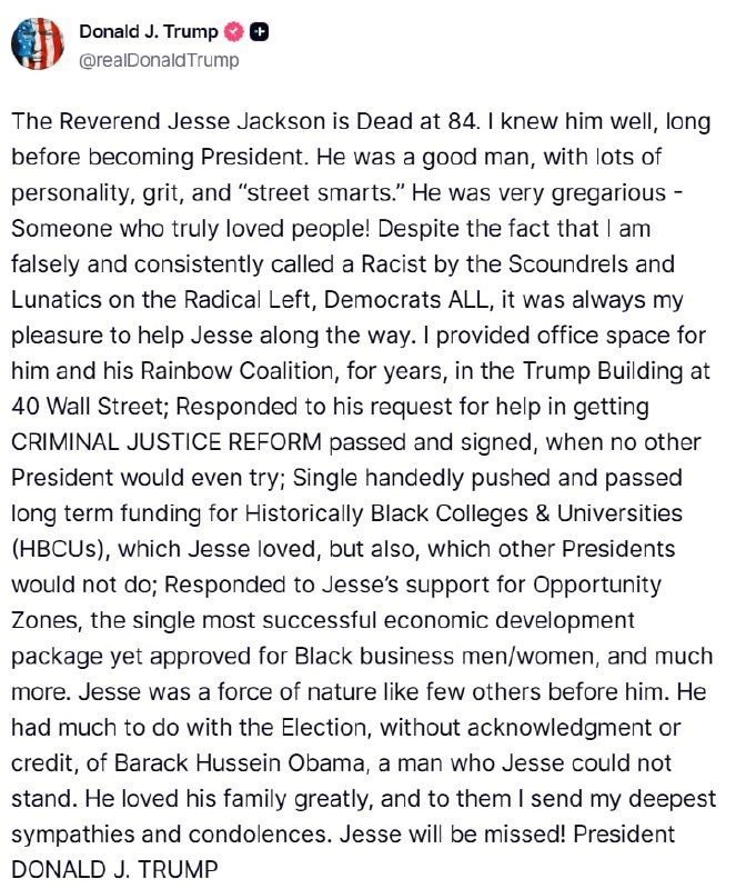 Trump pays tribute to Reverend Jesse Jackson 'He was a good man, with lots of personality, grit, and 'street smarts'' 'Despite consistently being called a Racist by Democrats ALL, it was always my pleasure to help Jesse along the way'