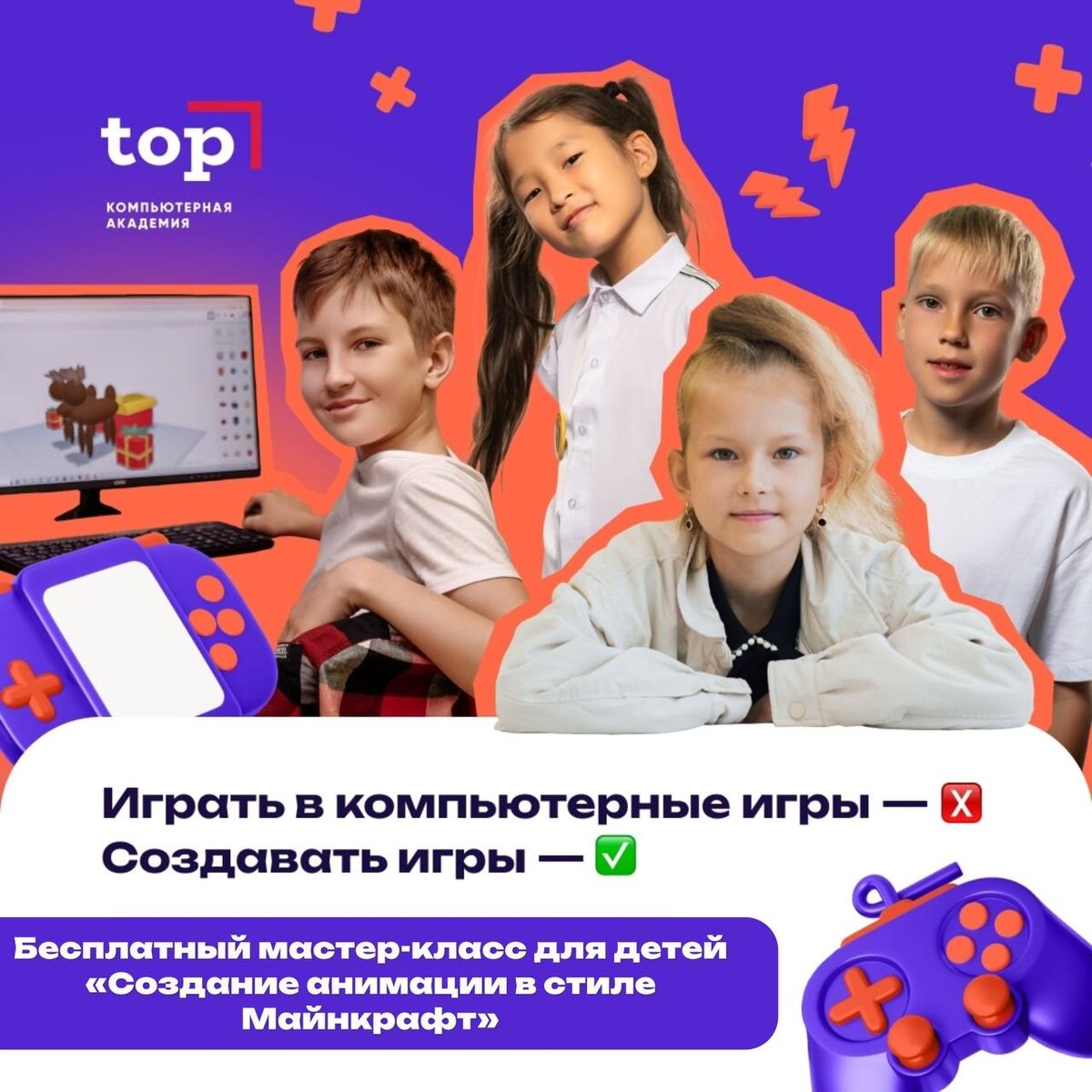 ! 👉 Бесплатный мастер-класс «Создание анимации в стиле Майнкрафт» Ваш ребенок сможет создать свою первую анимацию в популярном игровом стиле Minecraft! В Академии ТОП научат: 🍂 основам работы с анимационными инструментами, 🍂 созданию персонажей и объектов, 🍂 построению сюжета и раскадровки. 📅 Дата проведения: 21 февраля 13:00 📍 Место проведения: ул. Социалистическая, д. 141 🔑 Регистрация обязательна: оставьте заявку на сайте Присоединяйтесь к нашему сообществу юных креативщиков и помогите своему ребёнку раскрыть творческий потенциал! Не упустите шанс освоить новую интереснейшую профессию будущего вместе с нами!