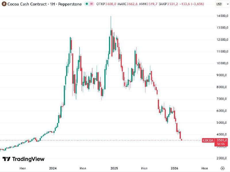 Шоколад на горизонте дешевеет — фьючерсы на какао уже просели до $3500 за тонну, а с декабрьских пиков 2025 года цена вообще рухнула