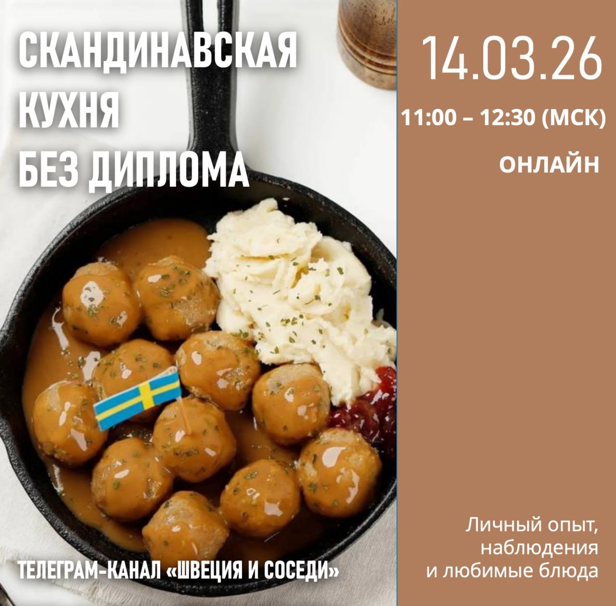 Приглашаем на онлайн-лекцию / живой разговор. Когда: 14 марта 2026, суббота. 11.00 - 12.30 по Москве или 9:00 - 10.30 по Гетеборгу Ведущие — мы, авторы канала «Швеция и соседи». Не шеф-повары, не гастроэксперты — просто фанаты, которые любят скандинавскую еду, много пробовали и готовили сами. На вебинаре вы узнаете: 🧁что реально едят в Швеции в повседневной жизни и по праздникам, а что туристический миф 🧁самые необычные блюда Скандинавии, которые удивляют вкусом и видом 🧁почему в Скандинавии так много селёдки, кофе и выпечки 🧁есть ли отличия в гастро-привычках в Северных странах 🧁что из скандинавских блюд легко повторить дома - простые рецепты и лайфхаки 🧁ответы на ваши вопросы 🎁 Бонус: PDF с простыми рецептами северных блюд для домашнего приготовления. ⭐️Участие платное, по цене чашки кофе*. Подробнее и регистрация *Бесплатно для тех, кто комментировал наши посты в этом году (с 1.01 по 15.02.2026) — просто пришлите нам скрин своего комментария (найти можно в чате, а отп