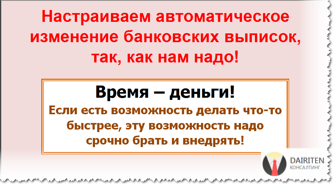 Всем привет. У вас бывает много платежей в день – входящих и исходящих? Если да, то я вас поздравляю! Мы придумали такую классную штуку, что мне даже обидно – и где все это было, когда я работала бухгалтером и вручную исправляла банковские выписки после загрузки их в 1 С. Актуально для тех, кому после загрузки выписки через банк-клиент (или управленческой базы), приходится изменять реквизиты вручную или групповой обработкой… То, что придумали мы, намного лучше, гибче и быстрее стандартной групповой обработки из бух.базы. Ну про ручное изменение итак все понятно. А началось все с того, что ко мне пришел клиент и хотел, чтобы мы ежедневно проводили ему выписки в бухгалтерской базе. «Легко» - сказала я, а потом увидела, что там от 100 до 350 платежей в день и все это ой как кривенько само ложится после загрузки из банка. Моему бухгалтеру надо потратить сколько-то времени (честно, я даже не стала пробовать и выяснять, сколько конкретно), чтобы все это ручками протыкать – вид операции, ст