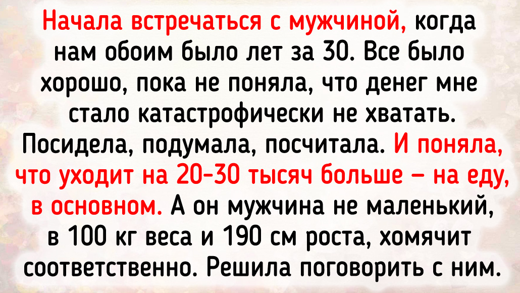 Начала встречаться с мужчиной, когда нам обоим было лет за 30. Все было хорошо, пока не поняла, что денег мне стало катастрофически не хватать. Посидела, подумала, посчитала. И поняла, что уходит на 20-30 тысяч больше — в основном, на еду. А он мужчина не маленький, в 100 кг веса и 190 см роста, хомячит соответственно. Решила поговорить с ним. Говорю, мол, будь добр, либо приноси продукты, либо давай денег на то, что поесть на ужин хочешь. В ответ услышала, что мы расстаемся и что нельзя так с людьми обращаться. Не ожидал он, бедняга, от меня такой меркантильности. © hahata / Pikabu