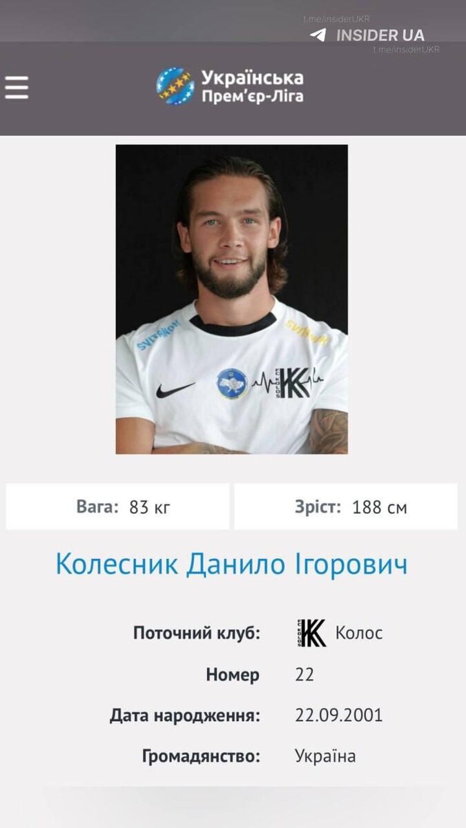 Игрок клуба «Колос», 24-летний Даниил Колесник, вступившись за задержанного, ударил ТЦКшника и выложил видео в Instagram*. Правда, контент вскоре он удалил, а страницу закрыл — похоже, набежали возмущённые «патриоты». Но интернет, как известно, помнит всё. UPD: В «Колосе» оперативно отреагировали на инцидент. Руководство клуба осудило своего спортсмена и заявило о разрыве контракта с ним. *запрещенная в России соцсеть; принадлежит компании Meta, признанной экстремистской организацией и запрещенной в РФ Сайт "Другая Украина" / Telegram / Вконтакте / Центр поддержки Украинцев / Жалоба на ТЦК "Другая Украина" теперь в МАХ
