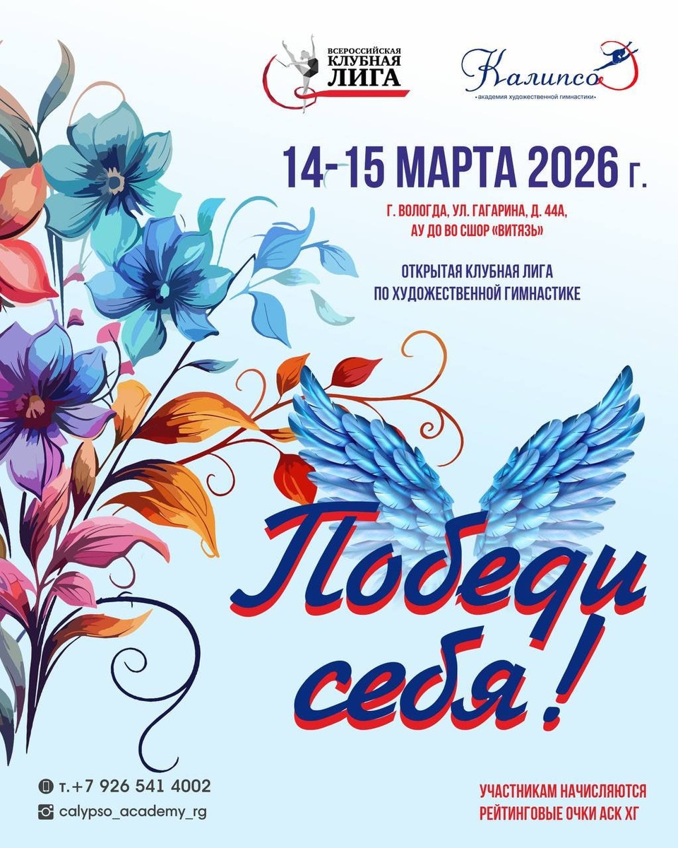 »🔥 14–15 марта 2026 года в Вологде пройдут соревнования по художественной гимнастике в рамках Открытой Клубной Лиги — турнир с сильным названием и ещё более сильной внутренней идеей💫 📍Место проведения: г. Вологда, ул. Гагарина, д. 44А. АУ ДО ВО СШОР «Витязь» 🏆Для участниц: — начисление рейтинговых очков Клубной Лиги; — возможность укрепить позиции в сезоне и сделать шаг вперёд в личном спортивном росте. 👤Судейская коллегия: Главный судья — Харисова Ольга Сергеевна Директор соревнований — Утюгова Наталья Юрьевна 🎀Организатор: СК АХГ «Калипсо» 📎Подробности и положение – на сайте: https://rgclubsleague.com/schedule/otkrytaya-klubnaya-liga-po-khudozhestvennoy-gimnastike-pobedi-sebya1494_99664/