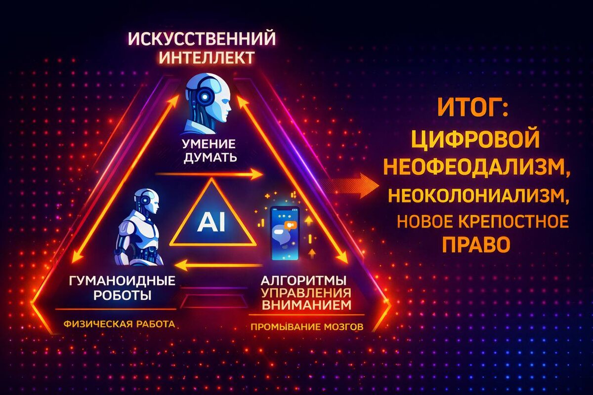 #опус_3 Китай уже вкатывает гуманоидных роботов. Маск хочет миллиарды роботов. Всех кормят сказками о веке изобилия. Но Это выглядит как прямой ответ на демографию. Людей будет меньше. Люди стареют. За стариками нужно ухаживать. Склады, сервис, производство должны работать. Значит, нужен синтетик. Железное тело плюс мозг. Робот как новая рабочая сила. И это не только Китай. Это общий вектор. AI забирает умственный слой. Роботы забирают физический слой. Алгоритмы забирают внимание и выбор. Вот треугольник технологий. Первое. AI, который думает и решает задачи уровня очень сильного спеца. Там, где раньше сидели отделы, теперь сидит один человек плюс модель. Второе. Гуманоидные роботы. Тело для AI. Доставка. Склад. Линии. Уборка. Уход за пожилыми. Все то, что держится на миллионах обычных людей. Третье. Алгоритмы управления вниманием. Ленты, рекомендации, реклама, поведенческие триггеры. Они лепят людям паттерны жизни. Что хотеть. Что считать нормой. Как жить. С кем быть. Зачем ро