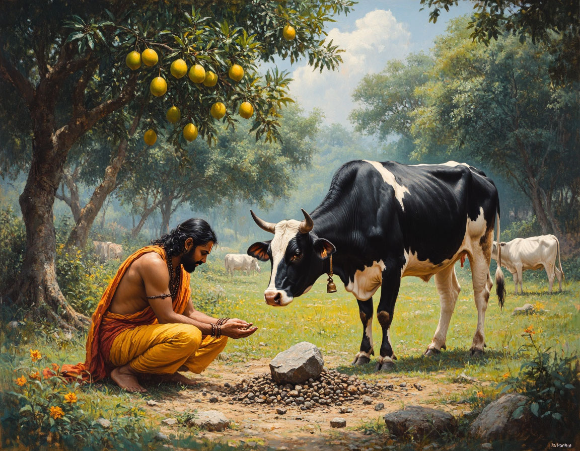 Жил благочестивый брамин, который ухаживал за прекрасным садом с манговыми деревьями. Однажды в сад забрела корова и нчала поедать молодые побеги. Брамин в гневе бросил в неё камень, попав в глаз, — корова погибла. Зная, что убийство коровы — тяжкий грех, брамин тайно закопал животное и продолжил вести праведную жизнь. Когда настал час его смерти, пришли Ямадуты (слуги Ямараджи, бога смерти), чтобы увести его в ад. Брамин воспротивился: — За что вы меня забираете? Я жил праведно! — Ты убил корову, — ответили Ямадуты. Тогда брамин, сведущий в философии Веданты, заявил: — Это не я убил. Это моя рука подняла камень. Я — лишь душа, я не осквернён. Ямадуты растерялись: в ведической традиции действительно считается, что действия совершают не люди напрямую, а полубоги, управляющие механизмами Вселенной. Они обратились к Ямарадже за разъяснением. Ямараджа явился к брамину в облике старика и зашёл в его сад. Восхищаясь красотой растений, он спросил: — Кто посадил этот дивный сад? — Я, — гордо о