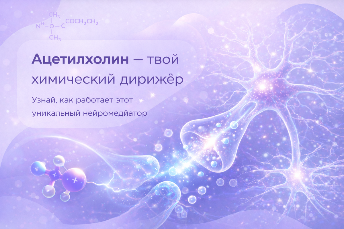 Каждое из этих действий - от движения пальцев до лёгкого изменения настроения - происходит не «само». Внутри тебя работает крошечный химический дирижёр. Его имя - ацетилхолин. Если проще: это молекула-передатчик. Она помогает нервным клеткам разговаривать друг с другом. Без неё твой мозг был бы похож на огромный офис без интернета - сотрудники есть, компьютеры есть, а связи нет. Ацетилхолин - один из первых открытых нейромедиаторов. И один из самых важных. Он управляет вниманием, памятью, мышцами, дыханием, сердцем и даже тем, насколько ты бодр или расслаблен. Когда ты сосредоточен - он активен.