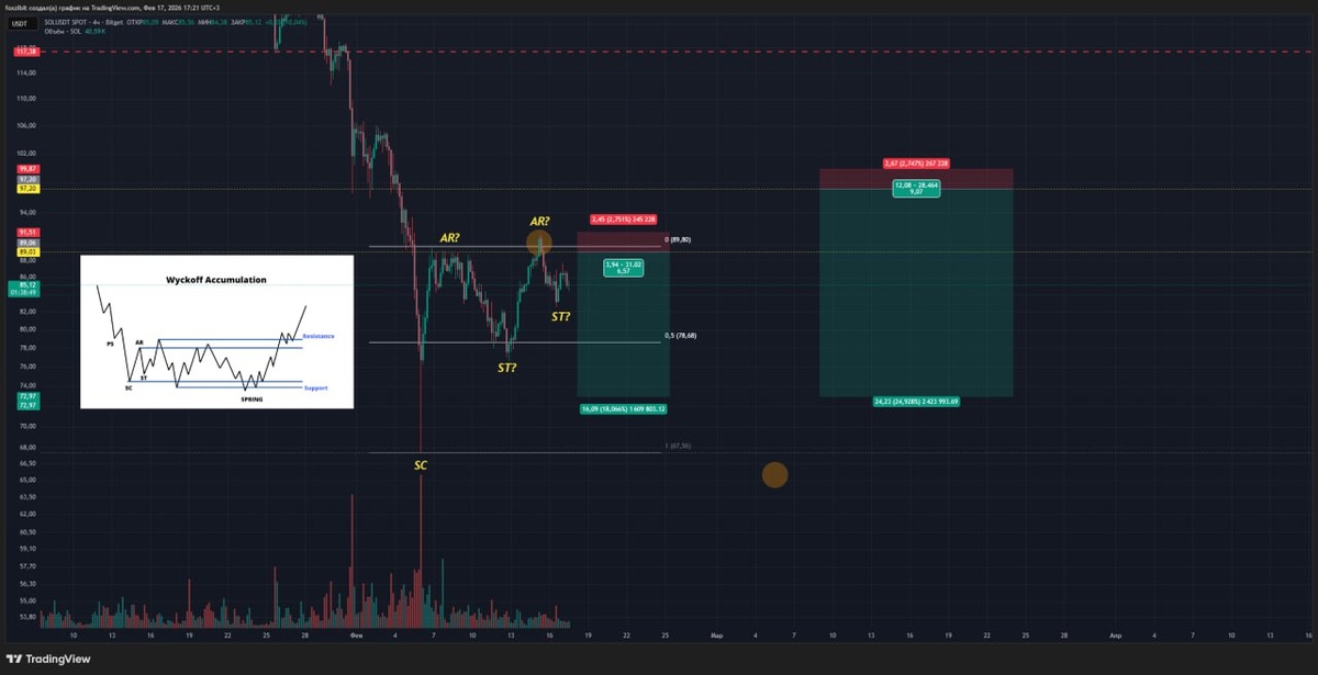 Идея №4 SOLUSDT пересмотр сценария Рынок успокоился и поэтому картина немного проясняется. Формирующийся паттерн напоминает схему аккумуляции Вайкоффа, но еще требует подтверждения (девиации снизу). Попытка расторговать данную схему на ее раннем этапе формирования. Как видно из графика, последняя девиация может служить разворотной точкой №1. В случае оверхая, буду ждать вторую вероятную точку разворота №2 в районе 97$. лонг с середины фитиля я больше не рассматриваю, но точка середины фитиля все еще может быть использована как консервативная цель для шорта (в случае если модель Вайкоффа не подтвердиться). Следующий лонг я буду пытаться брать на оверлое боковика. #SOL #Crypto #трейдинг