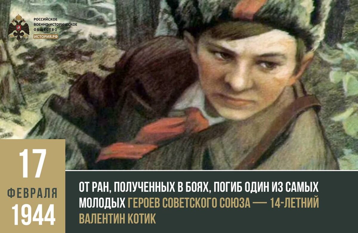 📆 17 февраля 1944 года от ран, полученных в боях, погиб один из самых молодых Героев Советского Союза — 14-летний Валентин Котик