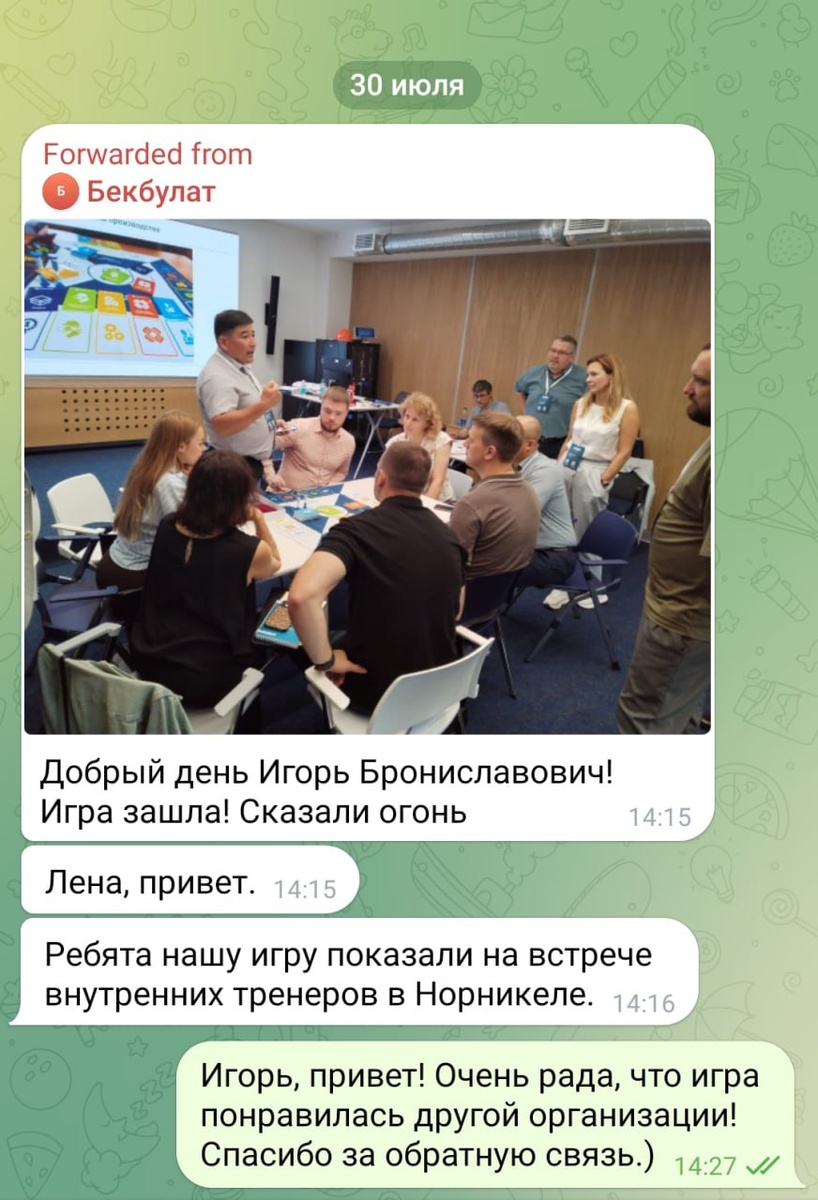 Добрый день, уважаемые коллеги, друзья, партнёры! Хочется поделиться живой историей. Вчера коллеги из АО "МХК "ЕвроХим" прислали обратную связь по игре 🔥 Делай осознанно работу🔥, которую на днях они провели для коллег из ПАО "ГМК "Норильский никель". Это говорит о том, что управление рисками во всех компаниях похожи, а игровые форматы вовлекают и за короткий период игрового времени дают максимальную картину по проблематике и путям решения. 🎲 Игра по динамической оценке рисков Делай осознанно работу. Задача каждого игрока/команды за 5 минут собрать триаду ДОР в зависимости от профессии и вида работ. Это повышает производительность. В игре заложена концепция на объединение участников и их вклада в общее дело. 🧩Подробнее о игре http://safetygames360.ru/magazinsg360/tproduct/662297140-648973958502-delai-osoznanno-rabotu