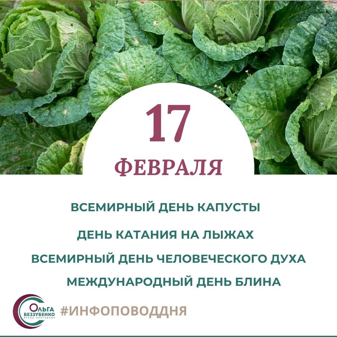Сегодня - Всемирный день капусты, День катания на лыжах, Всемирный день еловеческого духа, Международный день блина О чем рассказать: 💚Капуста и микробиом. Почему квашеная капуста полезнее свежей. Капуста для онкопрофилактики 💚Лыжи – нагрузка, требующая подготовки. Травмы новичков и как их избежать. Как дышать на морозе, чтобы не «сжечь» легкие 💚Влияние резилентности на здоровье и процесс выздоровления 💚Про Масленицу и блины мы уже говорили вчера. Можно добавить к этому свои рецепты блинов и начинок